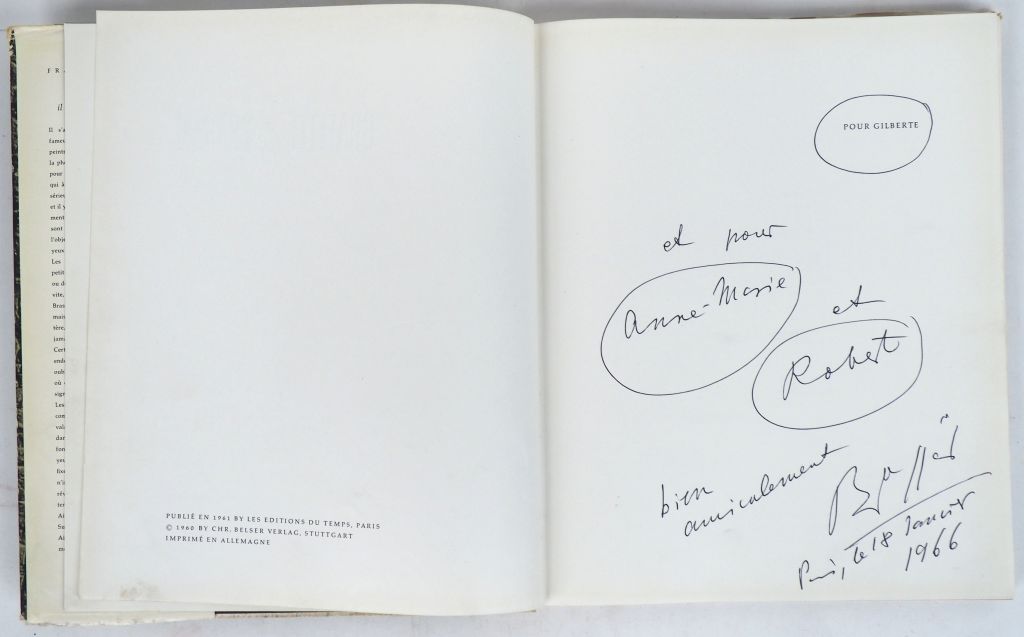 BRASSAÏ. GRAFFITI. Textes et photos de Brassaï et deux conversations avec Picasso. P., Éditions du temps, 1961. In-4 reliure toilée de l’éditeur, jaquette papier illustrée (usures et petites déchirures). PREMIÈRE ÉDITION FRANÇAISE. 105 reproductions de photographies en noir et blanc. E.A.S. sur le faux-titre : « Pour Gilberte [mention imprimée entourée par Brassaï] et pour Anne-Marie [entouré] et Robert [entouré] / bien amicalement / Brassaï / Paris, le 18 janvier 1966 ».