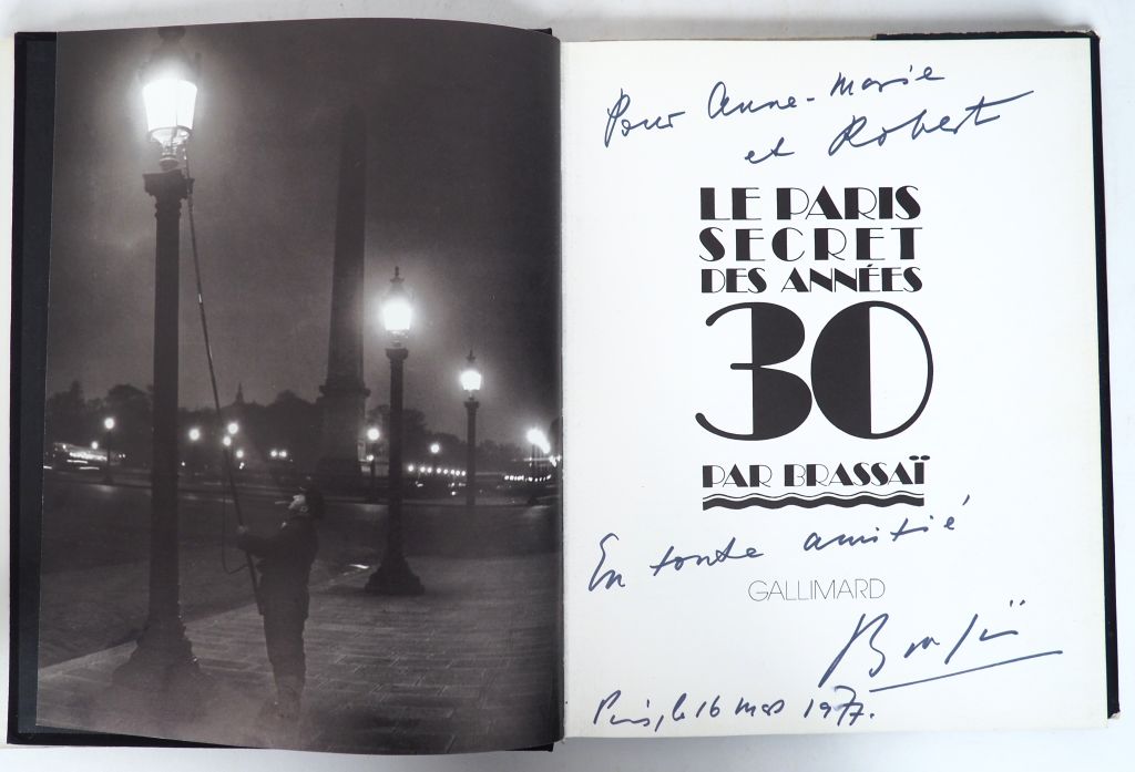 BRASSAÏ. LE PARIS SECRET DES ANNÉES 30. P., Denoël, 1976. In-4 reliure toilée de l’éditeur, jaquette papier illustrée (déchirures avec petits manques). ÉDITION ORIGINALE. 185 reproductions de photographies en noir et blanc. E.A.S. sur le faux-titre : « Pour Anne-Marie et Robert / En toute amitié / Brassaï / Paris, le 16 mars 1977 ».