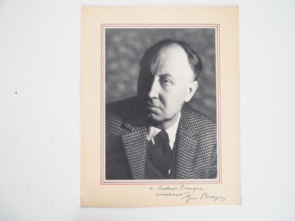 BRAYER (Yves). PORTRAIT PHOTOGRAPHIQUE ORIGINAL en noir et blanc. Photographie (19 X 14 cm) collée sur support carton. Au verso mention manuscrite « 1964 ». ENVOI AUTOGRAPHE SIGNÉ en marge inférieure au peintre Constant BARUQUE : « à Constant Baruque / Cordialement / Yves Brayer ».