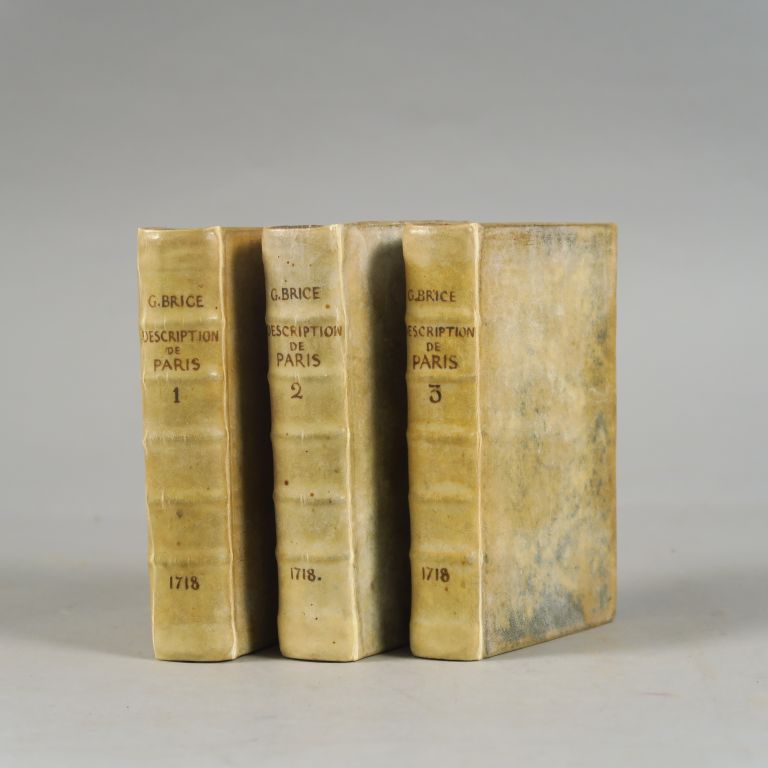 BRICE (Germain). Description de la ville de Paris et de tout ce qu'elle contient de plus remarquable. Septième édition. Amsterdam, Ch. Le Cene 1718. 3 vol. in-12. Vélin (Rel. postérieure). Description illustrée d'un frontispice, d'un grand plan depl. et de 63 figures gravées h.-t. Papier un peu bruni.