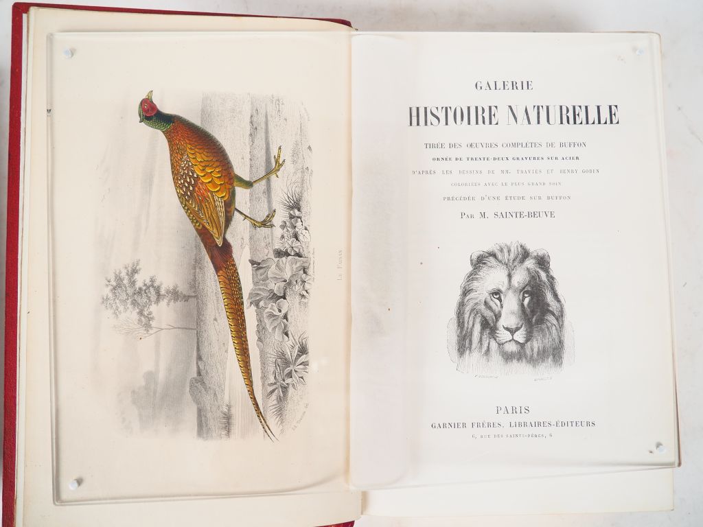 [BUFFON]. GALERIE D’HISTOIRE NATURELLE. P., Garnier frères, Grand in-8 ½ chagrin rouge de l’éditeur, dos à nerfs entièrement orné aux petits fers, titre doré, tranches dorées (Ch. Magnier rel.). Petit frottement en tête et queue du dos. ÉDITION ILLUSTRÉE de 32 PLANCHES d’animaux gravées sur acier, coloriées à l’aquarelle et gommées ainsi que de nombreuses vignettes en noir dans le texte. Exemplaire en BEL ÉTAT, pratiquement sans rousseurs et aux tranches bien lisses. JOINT : MULSANT (E.). LETTRES À JULIE SUR L’ORNITHOLOGIE. P., Laplace, [1868]. Grand in-8 ½ chagrin havane à coins, dos à nerfs orné de caissons dorés, titre doré, tête dorée (Reliure de l’époque). Petits frottements et épidermures. ÉDITION ILLUSTRÉE de 16 PLANCHES D’OISEAUX d’Édouard TRAVIÈS, lithographiées et coloriées. ¶ Nissen, 658, pour le 2nd ouvrage. ENSEMBLE DE 2 OUVRAGES.