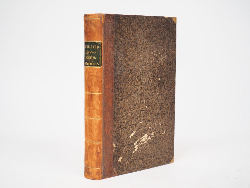 BULLIARD. HISTOIRE DES PLANTES VÉNÉNEUSES ET SUSPECTES DE LA FRANCE. P., Dugour, 1798. In-8 ½ basane fauve marbrée, dos lisse cloisonné, pièce de titre (Reliure de l’époque) , (2) ff., XVII-398 pp. Dos éclairci, frottements aux plats, pointes de rousseurs. SECONDE ÉDITION. ¶ Nissen, 296.
