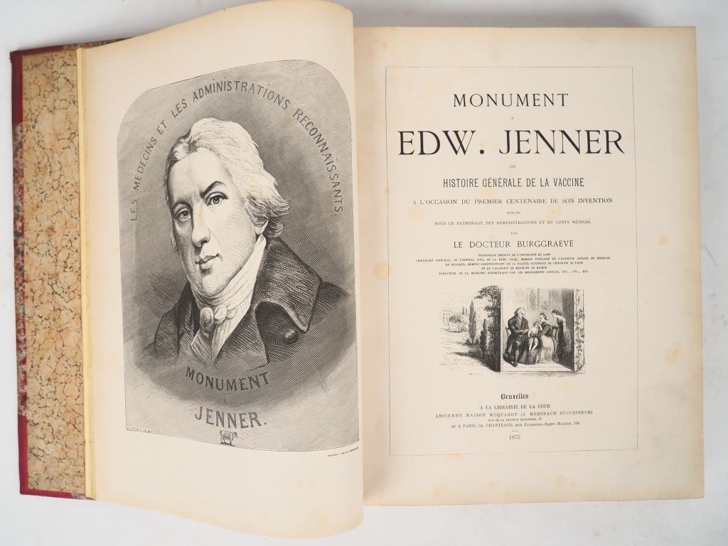 BURGGRAEVE (Docteur). MONUMENT À EDW. JENNER ou Histoire générale de la vaccine à l’occasion du premier centenaire de son invention. Bruxelles, Ancienne Maison Muquardt – Paris, Chanteaud, 1875. In-folio ½ chagrin rouge à coins, dos à nerfs orné, titre doré (Reliure de l’époque). Petites épidermures. UNIQUE ÉDITION de ce rare ouvrage. Il s’agit d’un hommage au médecin et scientifique anglais Edward JENNER (1749-1823), le premier à avoir mis au point le vaccin contre la variole et considéré comme le « père de l’immunologie ». PORTRAIT en frontispice, vignette de titre et 6 PLANCHES lithographiées h.-t., dont 5 en couleurs.