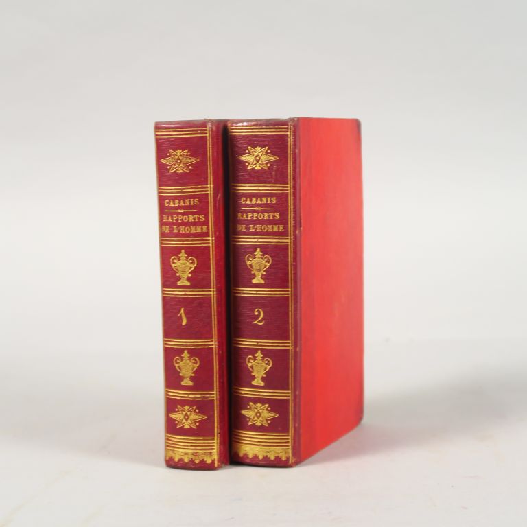 CABANIS (J. G). Rapports du physique et du moral de l'homme. Troisième édition préc. d'une table analytique par D. T et suivie d'une table alphabétique par Sue. Paris, Caille et Ravier 1815. 2 vol. in-8. 1/2 maroquin rouge à long grain à pts coins, dos long compartiment orné de vasque et de fleurs en étoile dor. (Rel. d'époque) Bel exemplaire, très frais