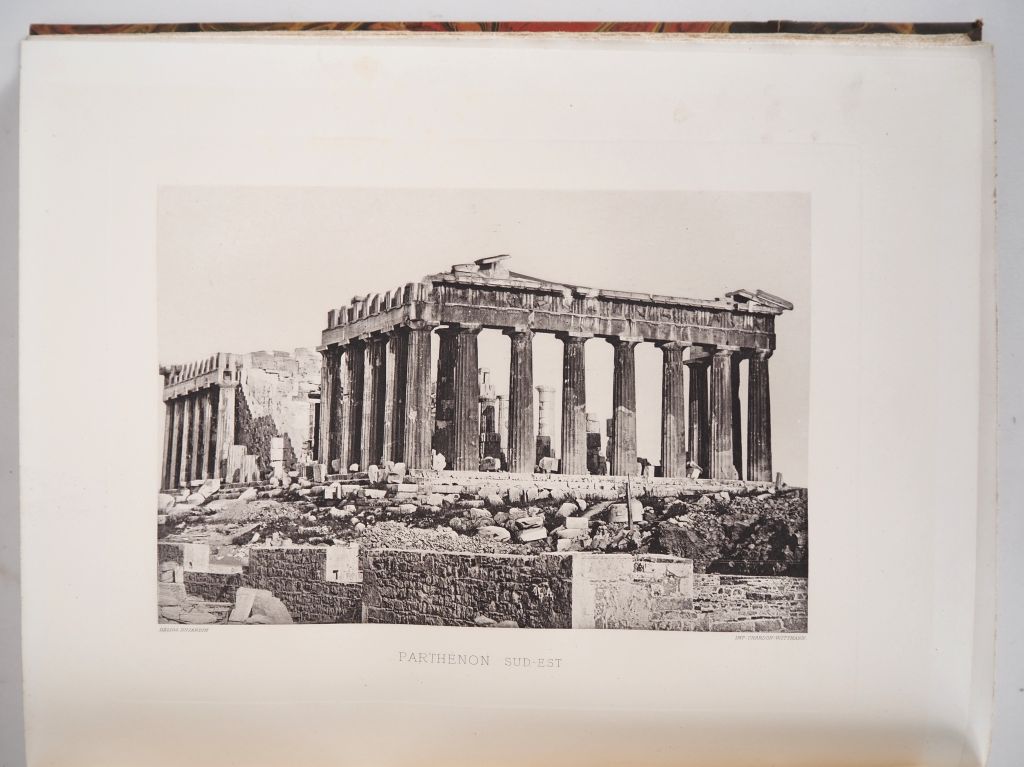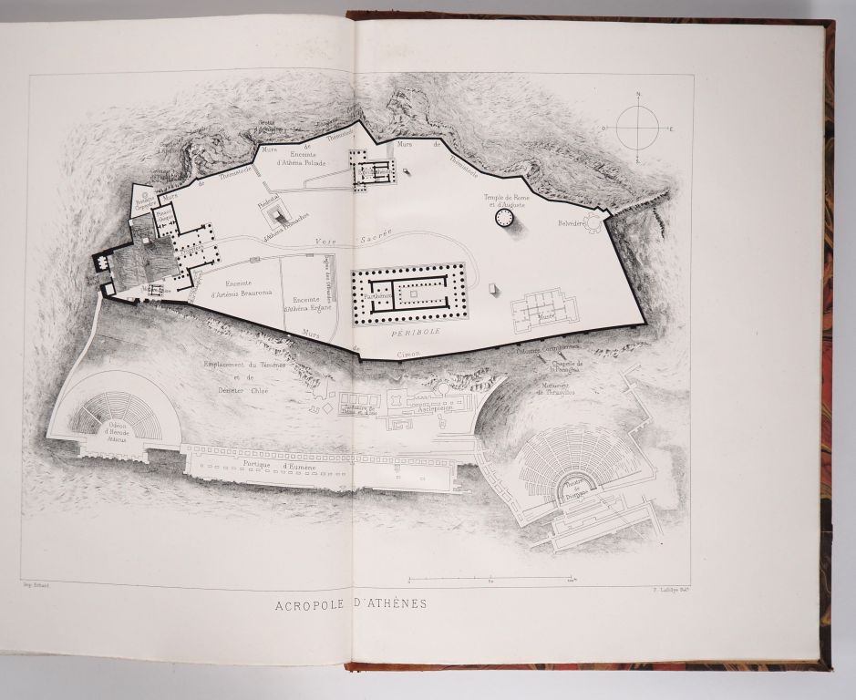 CABROL (Élie). VOYAGE EN GRÈCE. 1889. Notes et impressions. P., Librairie des Bibliophiles, 1890. Grand in-4 ½ basane fauve marbrée, dos à nerfs ornés de filets perlés dorés, fleuron doré, pièce de titre maroquin chaudron, couverture conservée (Reliure de l’époque). Quelques épidermures. ÉDITION ORIGINALE de cet ouvrage peu commun. Elle est ILLUSTRÉE de 21 PLANCHES h.-t. en héliogravure et 5 PLANS lithographiés h.-t. (dont celui de l’Acropole d’Athènes à double page). Tirage limité à 500 exemplaires.