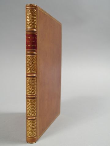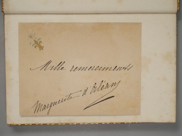 CATALOGUE OF THE ART TREASURES OF THE UNITED KINGDOM, collected at Manchester in 1857. London, Bradbury and Evans 1857. in-8, 233 pp. Veau blond glacé, dos orné à la grotesque, triple fil. d'encadr. dor. sur les plats, dent. int., coupes filetées, tr. dor. (Rel. d'époque). Exemplaire de Marguerite d'Orléans, qui l'a annoté et enrichi d'une carte de visite avec un mot de remerciements autographe. Bel exemplaire.