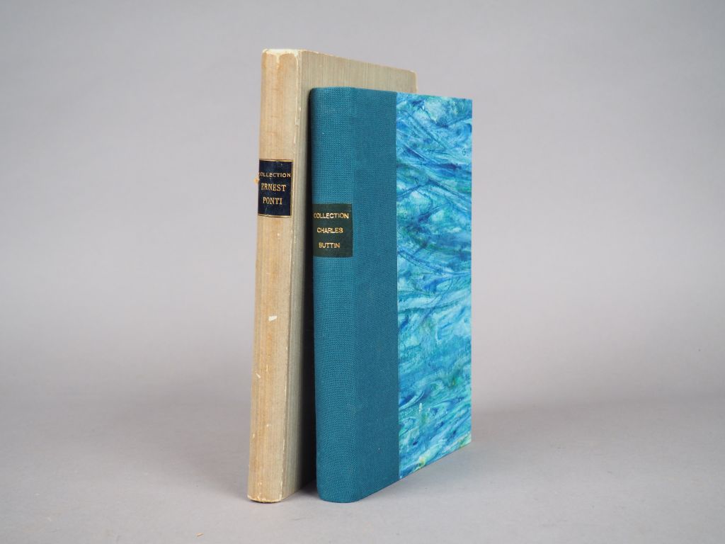 CATALOGUES. Catalogue de la collection d’Armes anciennes européennes et orientales de Charles BUTTIN. Rumilly 1933. In-8. Reliure ½ toile. Collection Ernest PONTI. Costumes et scènes militaires de tous pays. Costumes civils. Documents et livres anciens. Hôtel Drouot, Me Boisgirard 1935. In-4, cartonnage papier. Ensemble 2 volumes.