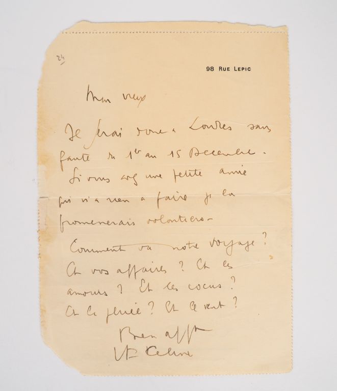 CELINE (Louis-Ferdinand). LETTRE AUTOGRAPHE signée et datée 29 X 1934, adressée à Londres à un ami, Mr Maurs, Carte correspondance timbrée 1p. Céline annonce sa venue à Londres du 1er au 15 décembre "si vous avez une petite amie qui n'a rien à faire je la promènerai volontiers […] Comment va votre voyage ? Et vos affaires ? Et les amours ? Et les cocus ? .."