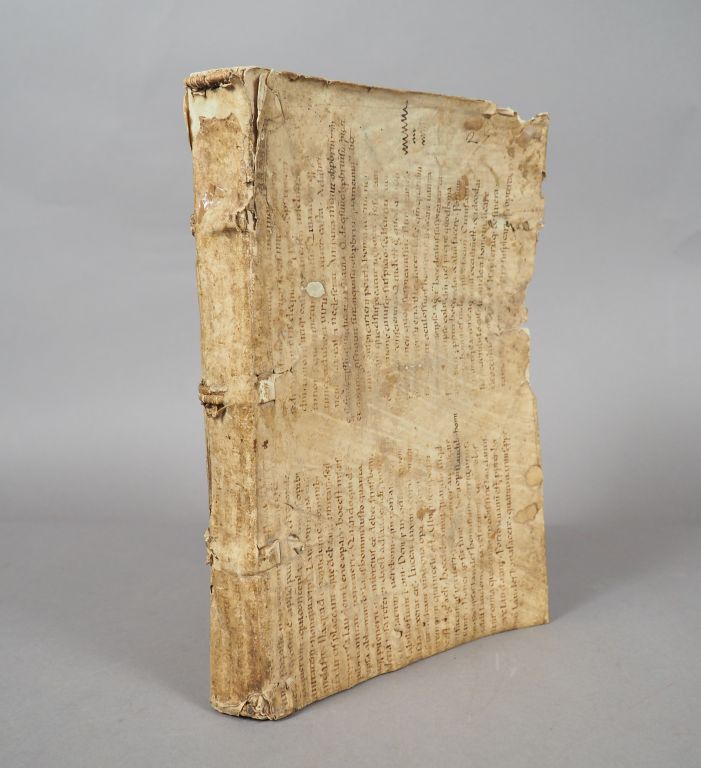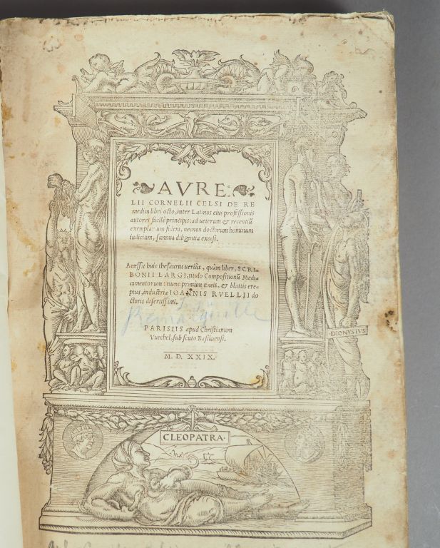 CELSIUS. Aurelii Cornelii Celsius. De re medica libri octo. – SCRIBUNIUS LARGUS. Compositionum Medicamentorum... Paris, Christ. Vuechel 1529. in-folio. 20 ff.n.ch.-126-31 fol.ch.-4 fol.n.ch. Rel. d'époque parchemin de réemploi, souple. Titre allégorique et lettrines historiées, gravés sur bois. Manque le dernier feuillet de la première partie (Selz) . (titre intermédiaire entre les 2 ouvrages).