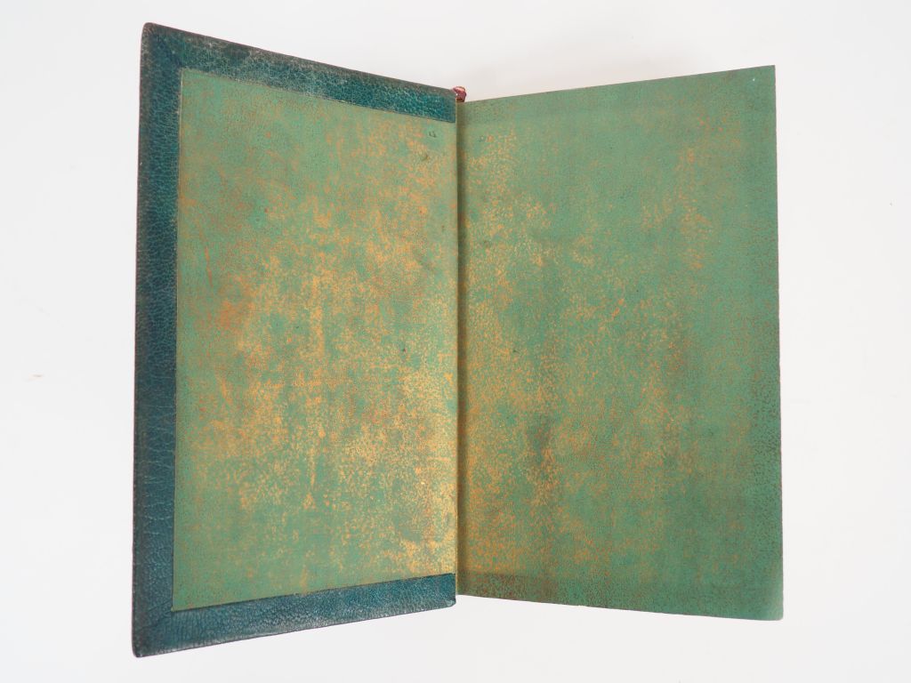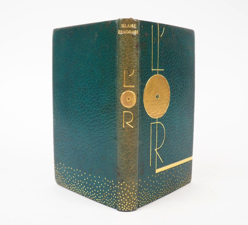 CENDRARS (Blaise). L’or. La merveilleuse histoire du général Johann August Suter. Paris, Grasset 1925. in-12, 278 pp-1 f. Reliure d’époque Art Déco maroquin vert à gros grain, titre doré sur le plat supérieur en filets gras et maigres, louis d’or au centre, sur lit de paillettes d’or en pied, tête dorée, couverture et dos conservés. Édition originale, rare, du premier roman de Cendrars. 1/2 exemplaire hors-commerce sur chine, justifié au crayon par l’éditeur. Rousseurs dans les barbes et intérieures sur une trentaine de ff. Expert : Roger Roques