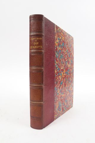 CERVANTÈS (Michel). L'ingénieux Don Quichotte de la Manche. Trad. nouvelle par Ch. Furne. Illustrée de 160 dessins par G. ROUX. Paris, Furne et Jouvet s.d. gd in-8. 1/2 maroquin havane, caissons à froid, tête dor., couv. et dos cons. (Rel. postérieure). Figures gravées sur bois, texte en 2 colonnes. Bel exemplaire frais, finement relié.