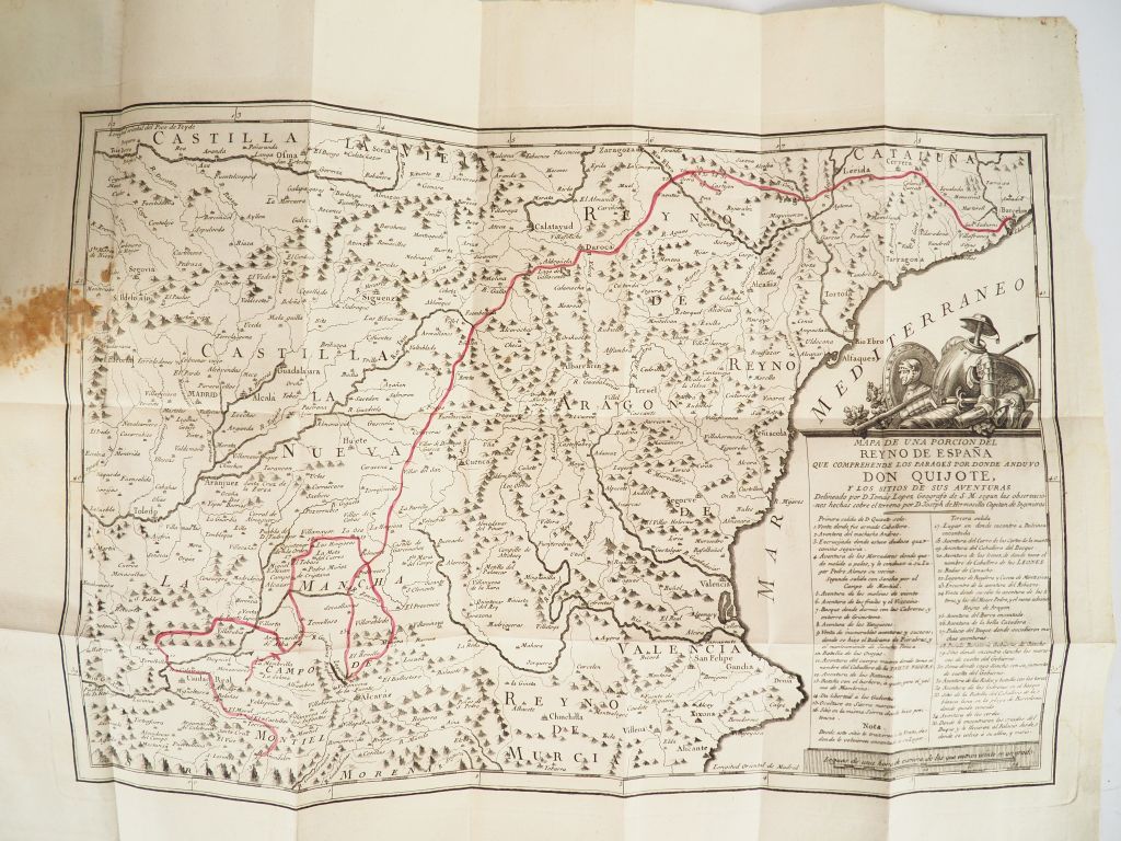 CERVANTES SAAVEDRA (Miguel de). El ingenioso hidalgo D. Quijote de la Mancha. Quarta édicion corregida por la Real Academia espanola. Madrid, en la Imprenta Real 1819. 4 vol. in-8. Reliure postérieure sur brochure non rognée, demi chagrin rouge. Les fragiles couvertures ont été conservées. (Manque le vol. V Vida de Miguel de Cervantes par D. Martin Fernandez de Navarrete. Edition illustrée de 20 figures hors-texte gravées par J. Rivelles et d'une carte