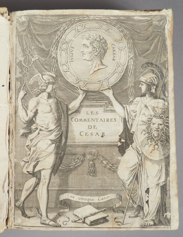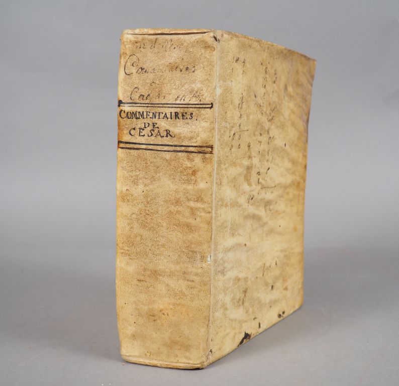 CÉSAR. Les Commentaires. Paris, J. Camusat et P. Le Petit 1650. in-4. 17 ff.n.ch.-96 pp.-623 pp.-64 pp. + table. Parchemin souple (Rel. d'époque). Frontispice, une carte et une planche dépl. La première partie est occupée par les Remarques sur la carte de l'ancienne Gaule par Sanson d'Abbeville. Traduction de Perrot d'Ablancourt. Trav. de vers en marge de quelques pages.