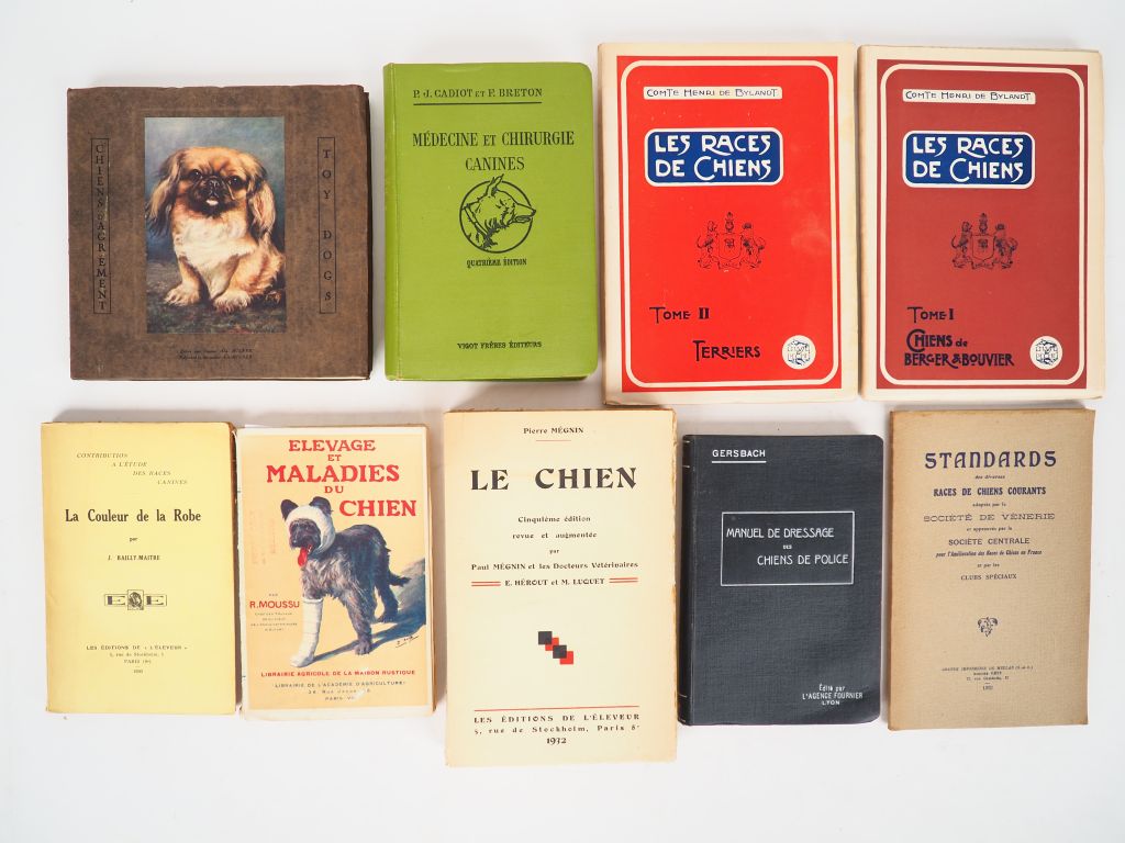 [CHASSE - CHIEN]. Standards des diverses races de chiens courants adoptés par la Société de Vénerie. (1922) – BYLANDT (Comte H. de). Les races de chiens. T. I : Chiens de berger bouvier - T. II : Terriers [1924] 2 vol. – MILNER (A.). Les chiens d’agrément. (1924) – CADIOT (P. J.) et BRETON (F.). Médecine et chirurgie canines. (1924) – BAILLY-MAITRE (J.). La couleur de la robe. (1930) – MOUSSU (R.). Élevage et maladies du chien. (1924) – MÉGNIN (P.). Le chien. (1932) – GERSBACH (R.). Manuel de dressage des chiens de police. (c. 1920). ENSEMBLE DE 8 OUVRAGES (6 brochés et 2 en cartonnage éditeur). 80/120 €