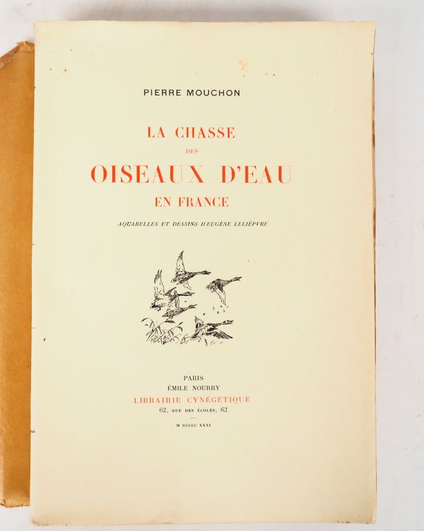 [CHASSE]. MOUCHON (Pierre). LA CHASSE DES OISEAUX D'EAU EN FRANCE. Paris, Librairie Cynégétique, 1931. Grand in-8 broché. Rousseurs aux tranches. ÉDITION ORIGINALE de ce bel ouvrage, l’un des meilleurs sur la chasse de la sauvagine. Il contient 16 PLANCHES h.-t. dont 6 en couleurs et est terminé par un intéressant Essai de bibliographie critique de la chasse au gibier d’eau. Tirage limité à 515 EXEMPLAIRES. UN des 450 numérotés sur Alfa satiné. ¶ Thiébaud, 669.
