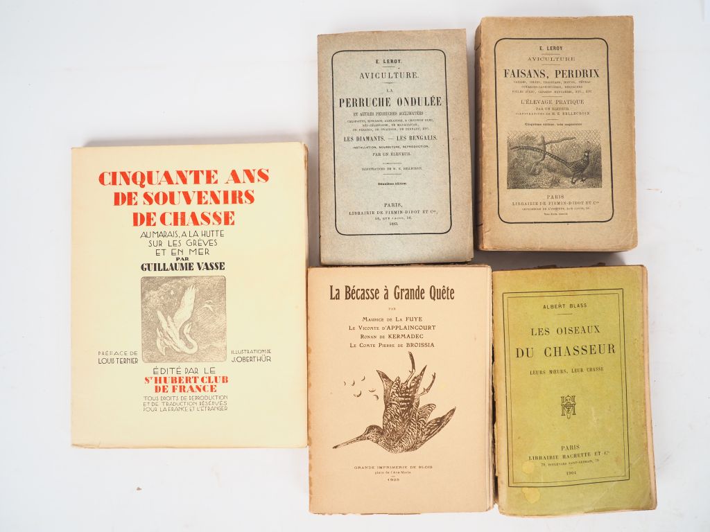 [CHASSE - OISEAUX]. BLASS (A.) LES OISEAUX DU CHASSEUR. Leurs mœurs, leur chasse. (1904) – LEROY (E.). Aviculture. FAISANS, PERDRIX. (1893) – LA FUYE (M. de) – APPLAINCOURT (Le vicomte d’). LA BÉCASSE À GRANDE QUÊTE. (1925) – LEROY (E.). Aviculture. LA PERRUCHE ONDULÉE et autres perruches acclimatées. Deuxième édition – VASSE (G.). CINQUANTE ANS DE SOUVENIRS DE CHASSE au marais, à la hutte, sur les grèves et en mer. (1928). ENSEMBLE DE 5 OUVRAGES.