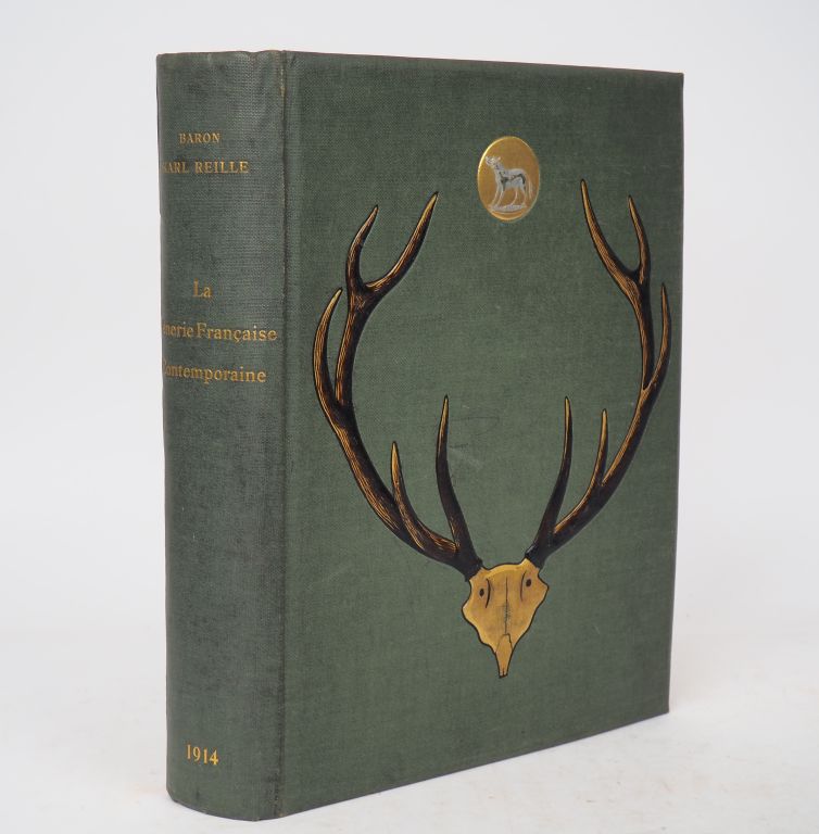 [CHASSE]. REILLE (Baron Karl). LA VÉNERIE FRANÇAISE CONTEMPORAINE. P., Le Goupy, 1914. Grand in-4 toile verte de l’éditeur, plat supérieur orné d’un massacre de cerf et pastille dorée illustrée, dos lisse, titre doré. Rousseurs claires. ÉDITION ORIGINALE. Illustrations en couleurs et en bistre. Tirage limité à 600 EXEMPLAIRES numérotés sur vélin. Exemplaire nominatif n°AHN de Monsieur R. d’Amboix de Larbont. Exemplaire enrichi d’une AQUARELLE ORIGINALE signée K. Reille à la justification. ¶ Thiébaud, 772 : « Ce beau volume est extrêmement recherché aujourd’hui et devient de plus en plus rare. »