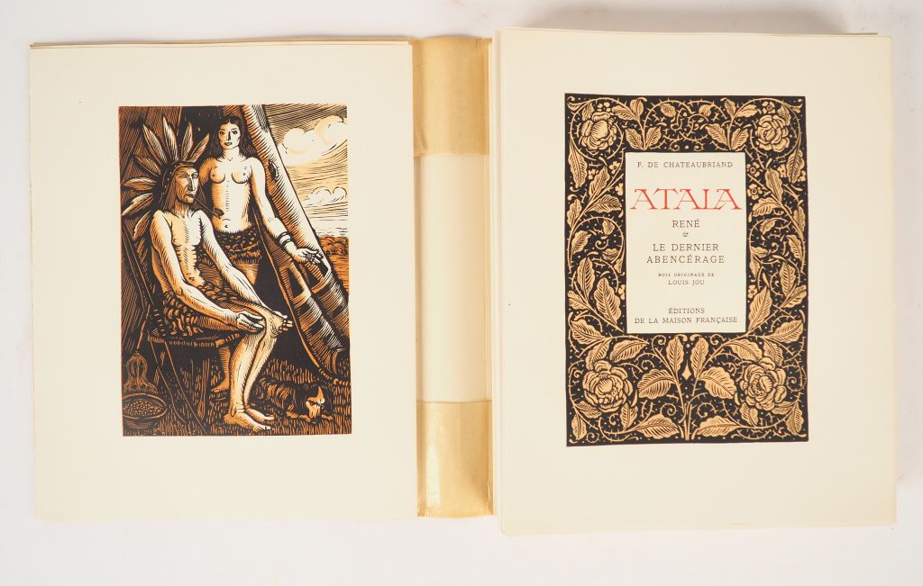 CHATEAUBRIAND (F. de). Atala, René et le dernier Abencerage. Bois originaux de Louis JOU. New York et Nice, Editions de la Maison française 1948. in-4 en ff. Chemise et étui. Bois en couleurs hors-texte et ornements dans le texte. Tirage unique sur pu chiffon corvol à 800 ex.