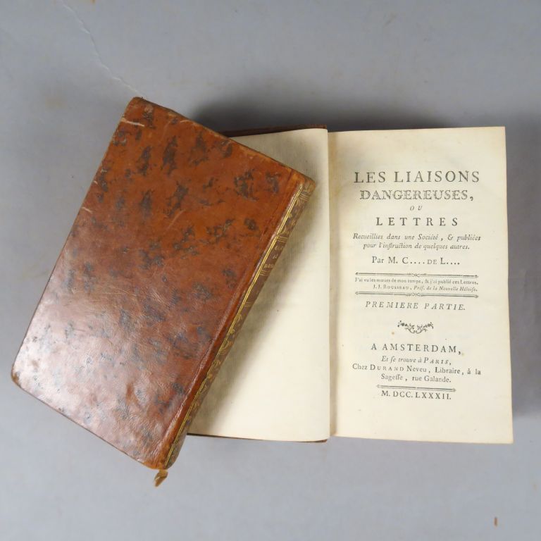 CHODERLOS DE LACLOS (Pierre). Les Liaisons dangereuses. Amsterdam et Paris Durand Neveu 1782. 4 tomes reliés en 2 vol. in-12, 248-242 pp et 231-257 pp. (Rel. de l'époque) Edition à la date de l'originale. Les tomes III et IV présentent toutes les caractéristiques du tirage III bis, décrit par Max Brun ("Contribution bibliographique des éditions des Liaisons dangereuses portant le millésime 1782") sur l'exemplaire de la Blibliothèque Nationale incomplet des tomes I et II. Bel exemplaire, très frais. Infime usure à deux coins