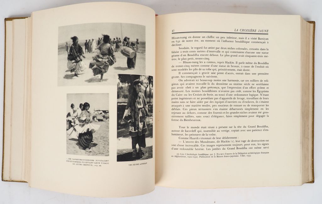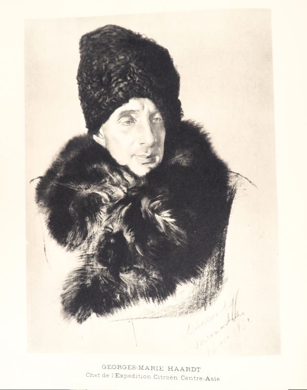 [CITROËN]. LE FÈVRE (Georges). Expédition Citroën Centre-Asie. LA CROISIÈRE JAUNE. Troisième mission. Georges-Marie Haardt. Louis Audouin-Dubreuil. Paris, Plon, 1933. Fort volume grand in-4 maroquin citron, premier plat orné au centre d’une vignette carrée estampée à froid en rouge et noir, dos cinq nerfs, titre en noir, tête dorée, large dentelle dorée intérieure, couverture conservée, étui cartonné postérieur (Reliure de l’éditeur). ÉDITION ORIGINALE. Frontispice, 123 photographies et 6 cartes dont 3 h.-t.