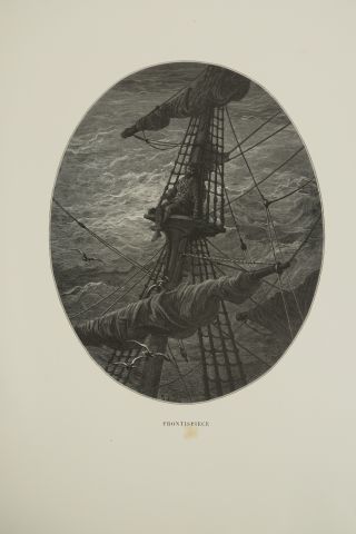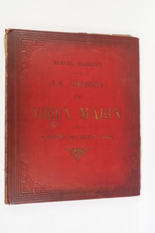 COLERIDGE (Samuel). La chanson du Vieux Marin, illustrée par Gustave DORÉ. The Rime of the Ancient Mariner. London, Doré Gallery, Hamilton, Adams and Co 1876. gd in-4. Percaline rouge de l'éditeur. Vignette au titre, frontispice et 38 planches de Doré gravées sur bois. Reliure défraîchie, mors fendu au plat sup.