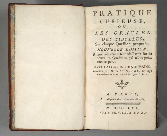COMMIERS. Pratique curieuse, ou Les Oracles des Sybilles sur chaque question proposée. Nouvelle édition augmentée d'une seconde partie... Avec la Fortune des Humains, inventée par M. Commiers et mise nouvellement en ce beau jour par L. D. T. Paris, les libraires associés 1770. 3 parties en 1 vol. in-12. Veau marbré, dos orné (Rel. d'époque). Bel exemplaire, frais. Edition la plus complète de ce classique de la divination (Caillet, 2530).