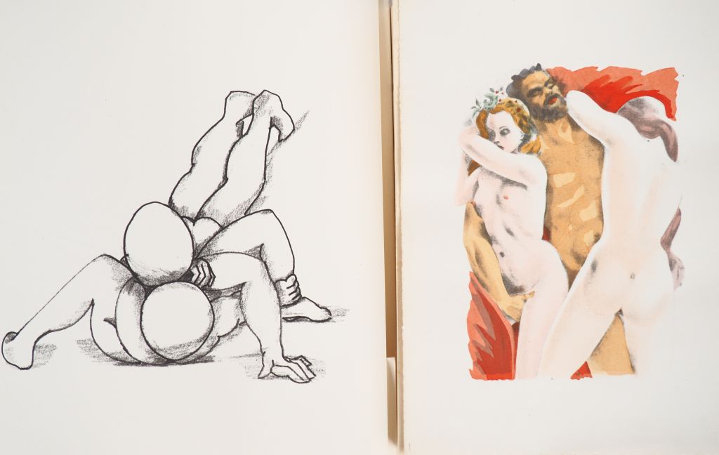CORCOS (Edmond). LES SIGNES DU ZODIAC SEXUEL. Béziers, Éditions Visions sur les Arts, sans date. Grand in-4 en ff. sous chemise à rabats imprimée, étui. Mouillures à l’étui, petite tache rouge en marge du 1er plat de la chemise. ÉDITION ORIGINALE constituée de 16 feuillets doubles avec illustration à pleine page et texte en vers libres en regard. Tirage limité à 300 exemplaires numérotés, celui-ci non justifié. ¶ Pas dans Dutel – MALHERBE – MAYNARD – M. RÉGNIER ET LES SATYRIQUES. GAILLARDISES. P., À l’enseigne de Cupidon, 1670 [c. 1950]. Petit in-4 en ff., chemise et étui. ÉDITION ILLUSTRÉE de 16 PLANCHES LIBRES en couleurs anonymes. Tirage limité à 516 exemplaires. UN des 500 numérotés sur vélin. ¶ Dutel, 1622. ENSEMBLE DE 2 OUVRAGES.