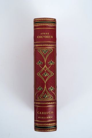 COUVREUR (André). Caresco, Surhomme ou le voyage en Eucrasie. Conte humain. Illustré par Edmond Malassis. Paris, librairie Plon s. d. (ca 1900). pt in-8. 1/2 maroquin rouge vif à coins, décor Modern'Styl, doré et mosaïqué, tête dor., couv. et dos cons. (Rel. d'époque). Illustrations en couleurs h.-t. et en noir dans le texte. Rare et curieux roman d'anticipation. Bel exemplaire du tirage à 40 ex. sur papier Japon, enrichi d'un envoi a.s. à François Boissier : « en souvenir du temps où nous allions en Eucrasie - un peu, très peu ! - ».