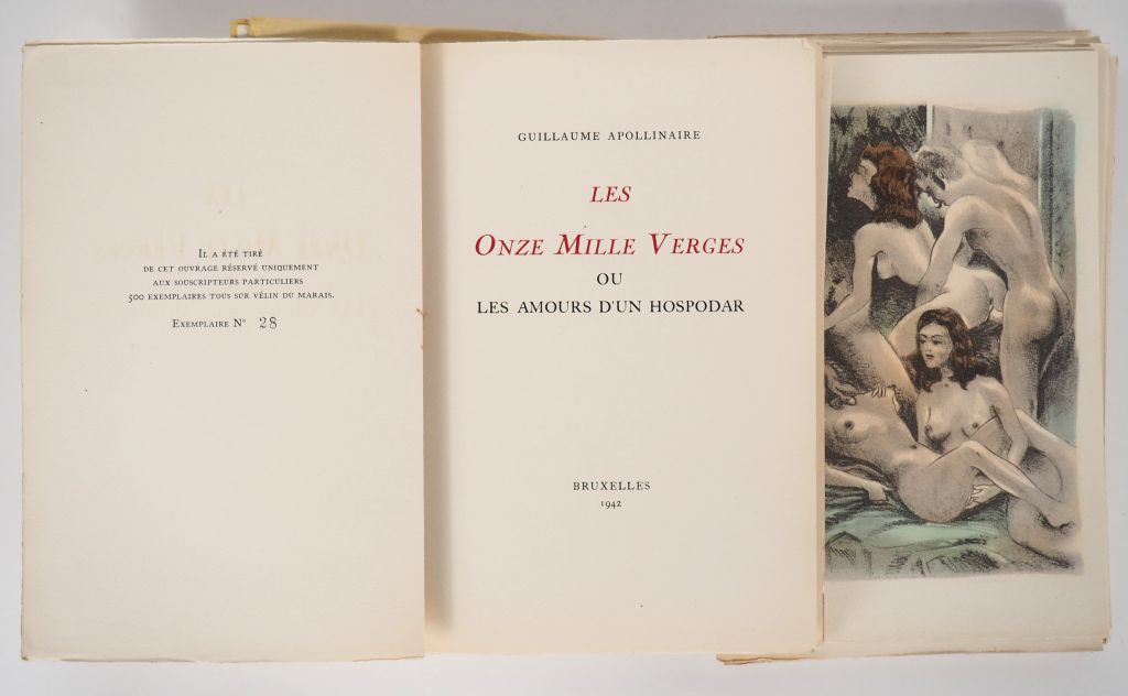 [CURIOSA]. APOLLINAIRE (G.). LES ONZE MILLE VERGES ou Les Amours d’un hospodar. Bruxelles, 1942. In-8 en ff. sous chemise et étui cartonnés de l’éditeur. Petit accroc sans manque à l’angle supérieur droit du dernier feuillet. ÉDITION ILLUSTRÉE de 9 compositions en couleurs h.-t. libres et de 9 bandeaux en noir. Tirage limité à 500 EXEMPLAIRES numérotés sur vélin du Marais. ¶ Dutel, 2109 : « Édition publiée vers 1950 » qui annonce probablement à tort 10 h.-t. car les exemplaires consultés n’en contiennent que 9, un par chapitre - Pas dans Pia.