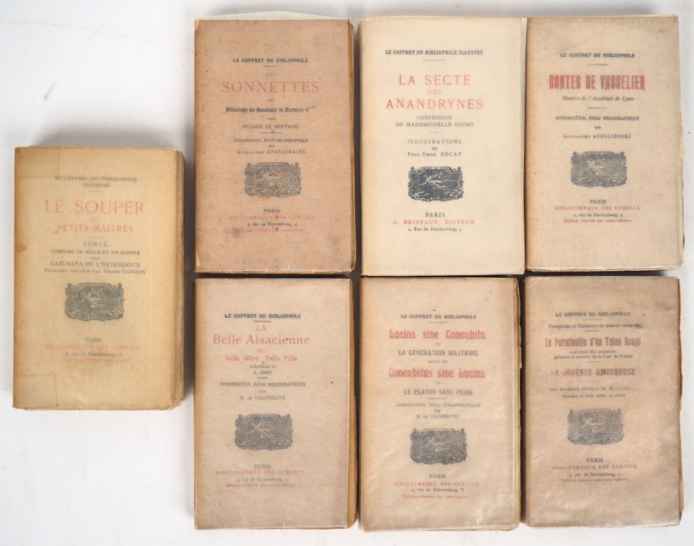 [CURIOSA]. COFFRET DU BIBLIOPHILE [ILLUSTRÉ pour les 2 derniers volumes] (Le). ENSEMBLE DE 7 OUVRAGES. 7 volumes in-16 brochés, les 5 premiers imprimés sur vergé d’Arches à la forme. - LE PORTEFEUILLE D’UN TALON ROUGE – LA JOURNÉE AMOUREUSE. 1910. - BRET (A.). LA BELLE ALSACIENNE ou Telle Mère, Telle fille. Introduction, essai bibliographique par B. de Villeneuve. 1911. - GUIARD DE SERVIGNÉ. LES SONNETTES. Introduction, essai bibliographique par Guillaume Apollinaire. 1913. Dos fendu. - CONTES DE VASSELIER. Introduction, essai bibliographique par Guillaume Apollinaire. 1913. - LUCINA SINE CONCUBITA ou La Génération solitaire suivi de Concubitus sine Lucina ou Le Plaisir sans peine. Introduction, essai bibliographique par B. de Villeneuve. 1914. Fente au dos. - CAILHAVA DE L’ESTENDOUX. LE SOUPER DES PETITS-MAITRES. Confession de Mademoiselle Sapho. 1934. 12 h.-t. couleurs de Pierre GANDON. Fentes au dos recollées, taches à la couverture. - LA SECTE DES ANDROGYNES. Confession de Mademoiselle Sapho. 1952. 12 h.-t. couleurs de Paul-Émile BÉCAT.