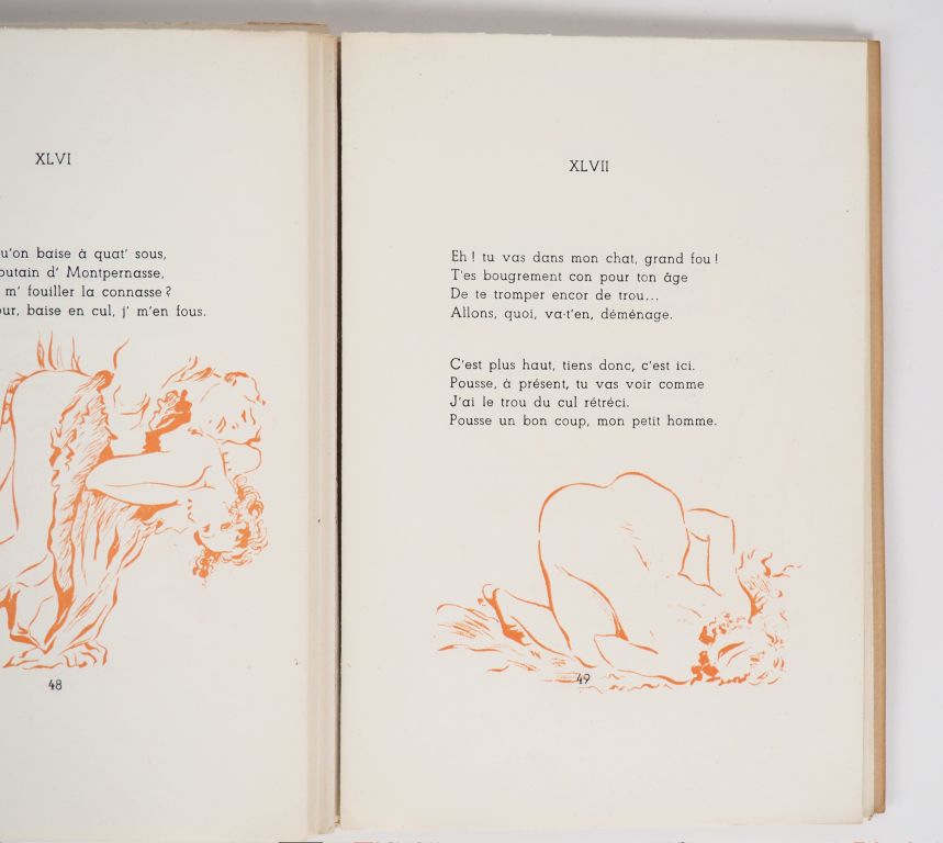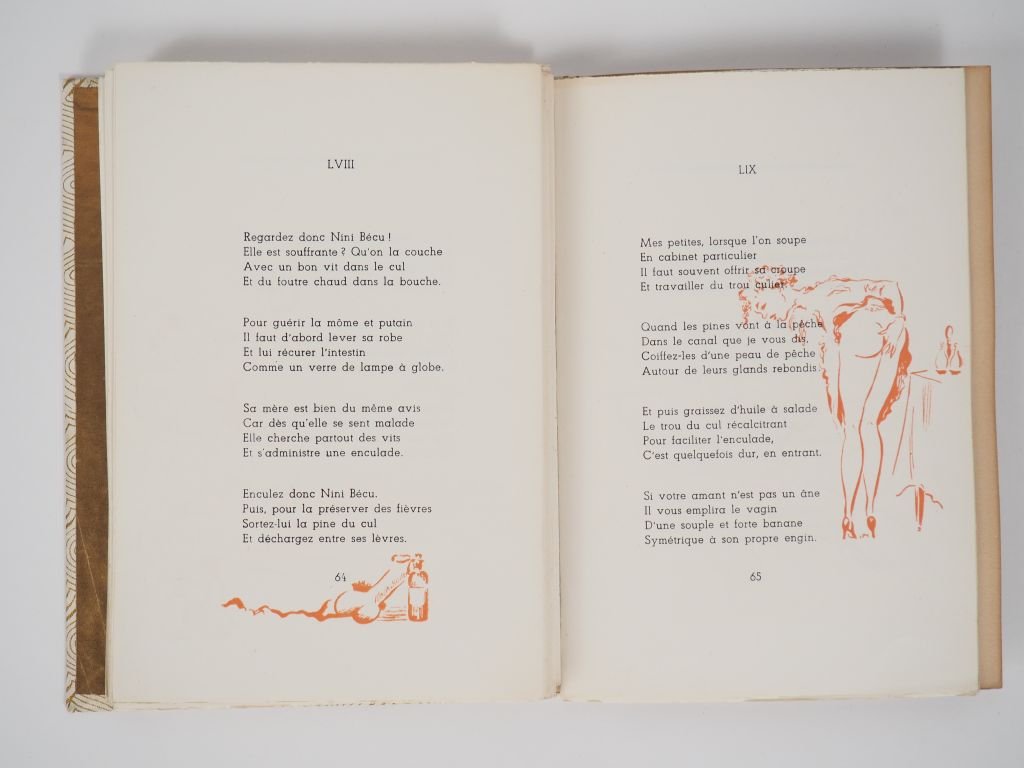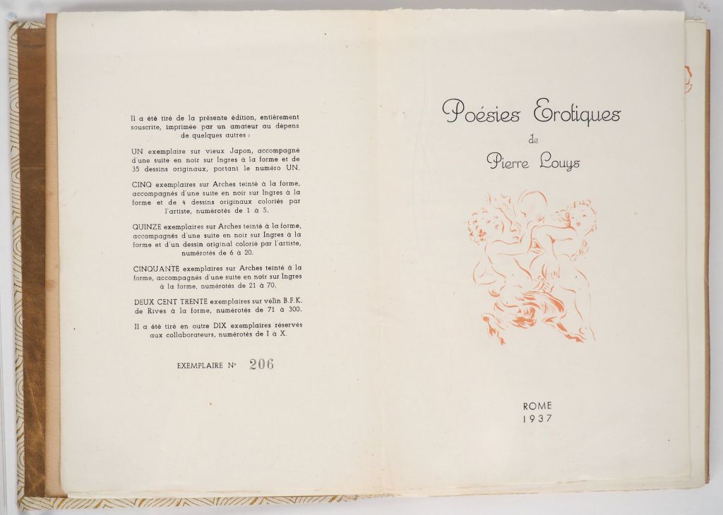 [CURIOSA]. LOUYS (P.). POÉSIES ÉROTIQUES. Rome, 1937. In-8 en ff. sous chemise et étui cartonnés de l’éditeur. Couverture brunie. ÉDITION ILLUSTRÉE de 73 dessins libres dans le texte, tirés en sanguine, par Fedor ROJANKOVSKI, dit Rojan. Tirage limité à 310 EXEMPLAIRES. UN des 230 numérotés sur vélin B.F.K. de Rives à la forme. ¶ Dutel, 2230.
