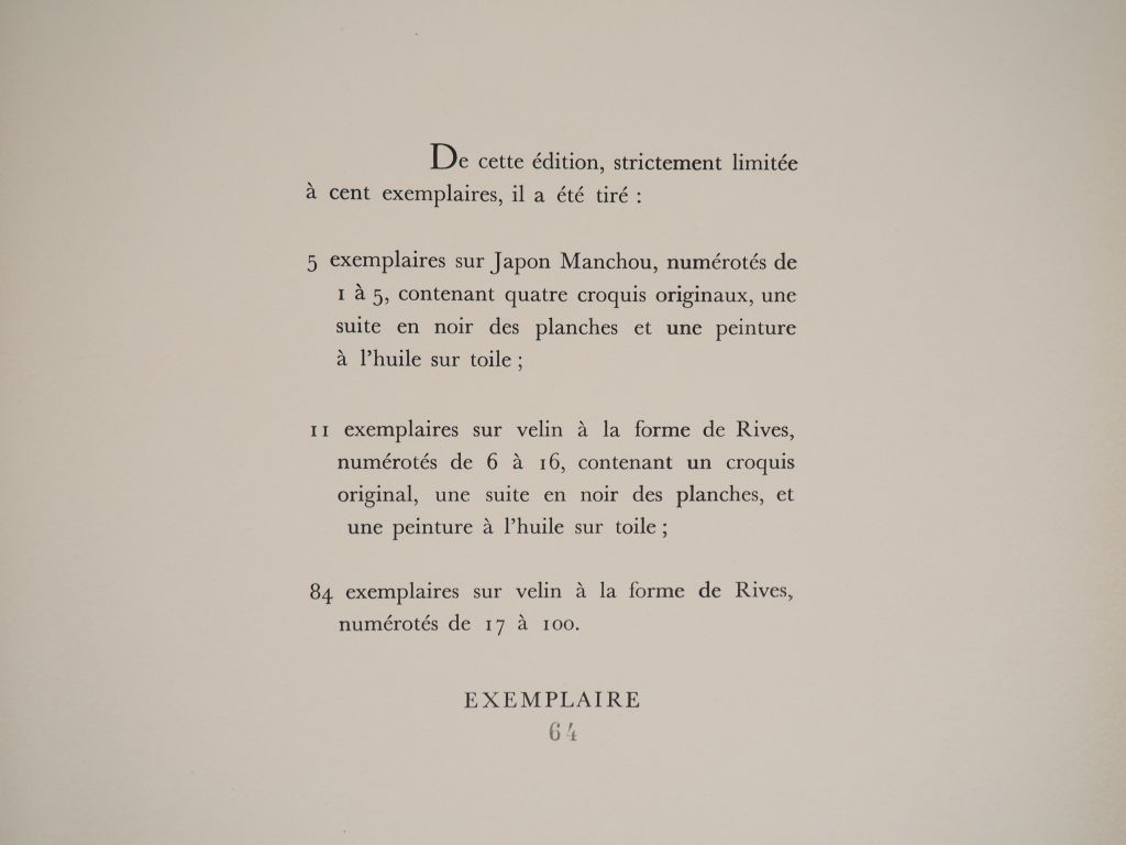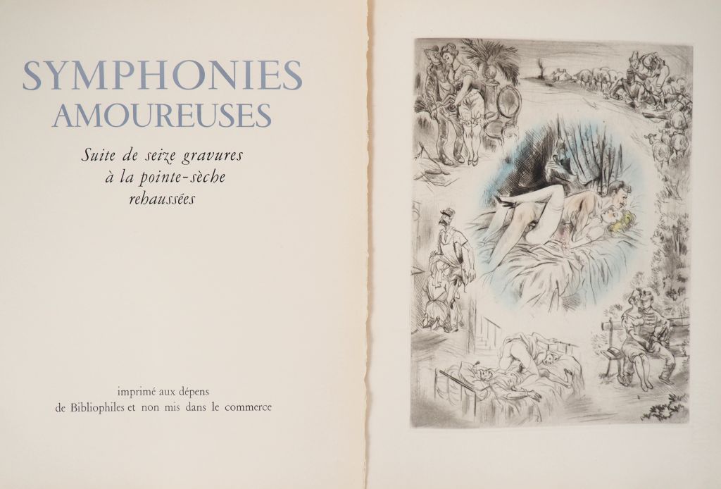 [CURIOSA]. SYMPHONIES AMOUREUSES. Imprimé aux dépens de Bibliophiles et non mis dans le commerce, [vers 1960]. In-folio en feuilles sous couverture rempliée. ÉDITION ORIGINALE de cette SUITE de 16 GRAVURES LIBRES à la pointe-sèche, rehaussées en couleurs, avec un dessin gravé au 1er plat de la couverture. Tirage limité à 100 EXEMPLAIRES. UN des 84 numérotés sur vélin à la forme de Rives. ¶ Dutel, 2478.