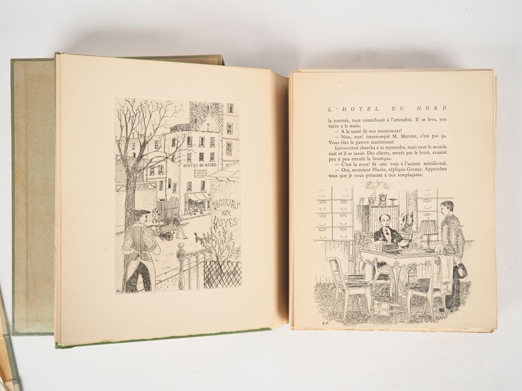 DABIT (Eugène). L'Hôtel du Nord. Illustré de 56 eaux-fortes par Rémy HETREAU. Paris, Denoël 1944. pt in-4 en ff. Chemise et étui cartonné. Eaux-fortes en noir dans le texte et hors-texte. Tirage : 301 ex. 1/270 ex. sur vélin d'Arches