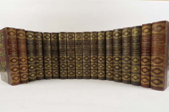 DAUDET (Alphonse). Œuvres complètes. Edition définitive, illustrée de gravures à l'eau-forte d'après les dessins de Emile Adan, A. Dawant, A. F. Gorguet, P.-A. Laurens et C. Léandre. Préc. d'un essai de biographie littéraire par Henry Céard. Paris, Alexandre Houssiaux 1899. 18 vol. gd in-8. 1/2 chagr. vert ou havane, caissons ornés aux pts fers (Rel. d'époque). Quelques dos passés.