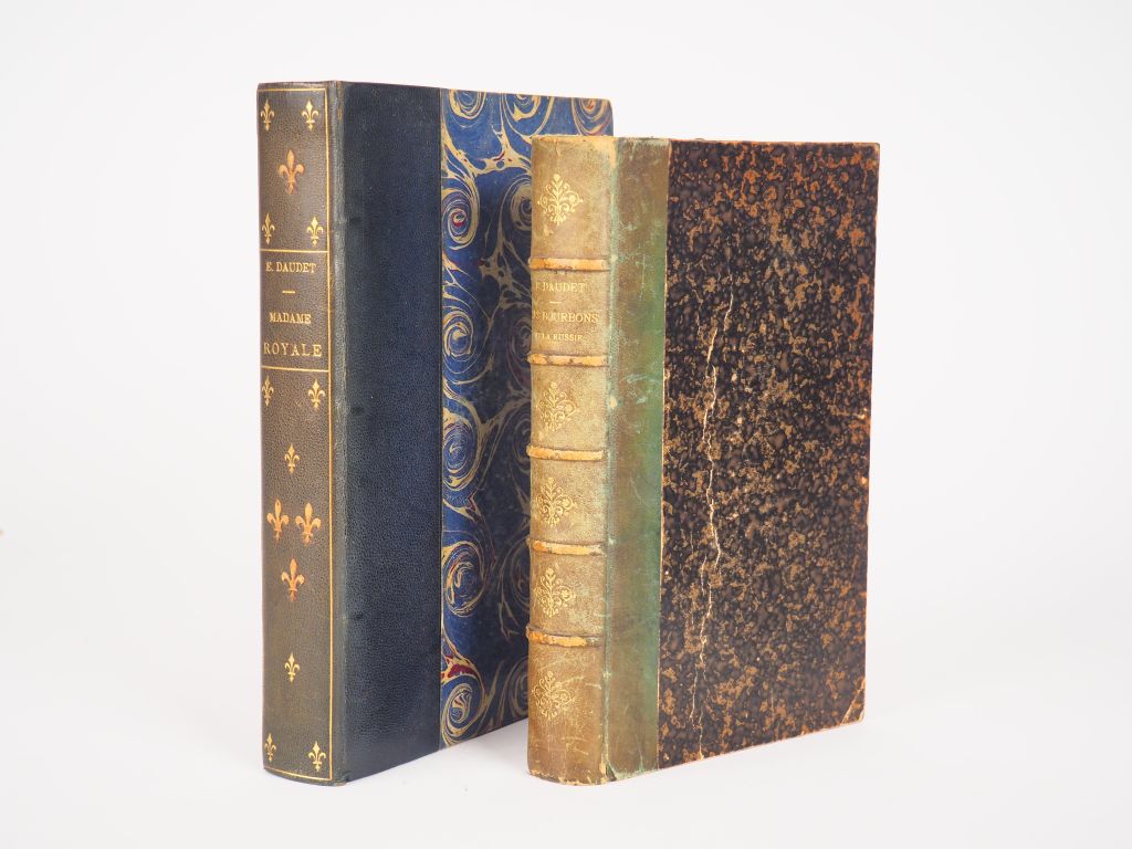DAUDET (Ernest). Madame Royale, fille de Louis XVI et de Marie-Antoinette. Sa jeunesse, son mariage. Paris, Hachette s.d. in-8. Reliure demi-chagrin ardoise, dos long orné de fleurs de lys dor. - DAUDET (Ernest). Les Bourbons et la Russie pendant la Révolution française. Paris, A la Librairie illustrée s.d. in-8. Rel. demi-basane verte, fleur. dor., dos passé. Ensemble de 2 volumes