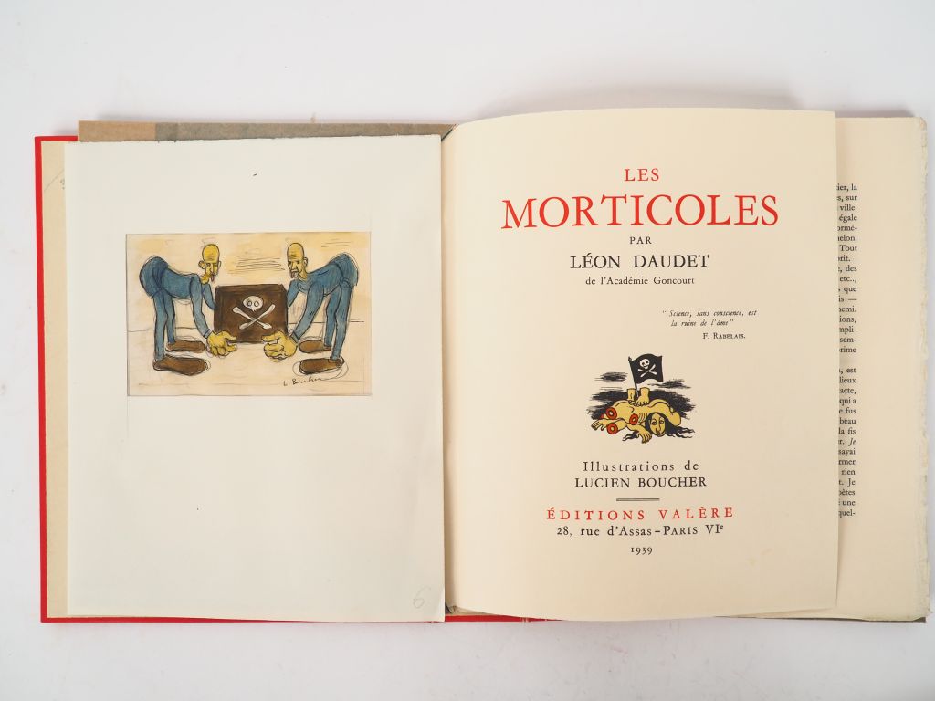 DAUDET (L.). LES MORTICOLES. Valère, 1939. In-4 en ff. sous chemise (dos passé) et étui de l’éditeur. ÉDITION ILLUSTRÉE de compositions couleurs de Lucien BOUCHER. Tirage limité à 1550 EXEMPLAIRES. UN des 75 numérotés sur Annam. L’exemplaire ne contient pas le dessin original en noir ni la suite des illustrations en noir annoncés, mais est enrichi d’un DESSIN ORIGINAL couleurs sur calque.
