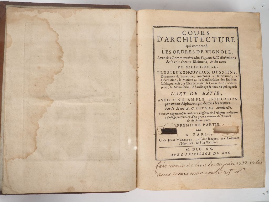 DAVILER (C.A.). Cours d'architecture qui comprend les Ordres de Vignole, avec des commentaires, les figures et descriptions de ses plus beaux bâtiments et de ceux de Michel-Ange… Paris, Mariette 1720. pt in-4. Rel. d'époque basane, dos lisse orné. Plus de 100 planches gravées, certaines doubles et dépliantes. Quelques déchirures restaurées. Ex. libris manuscrit découpé en p. de titre.