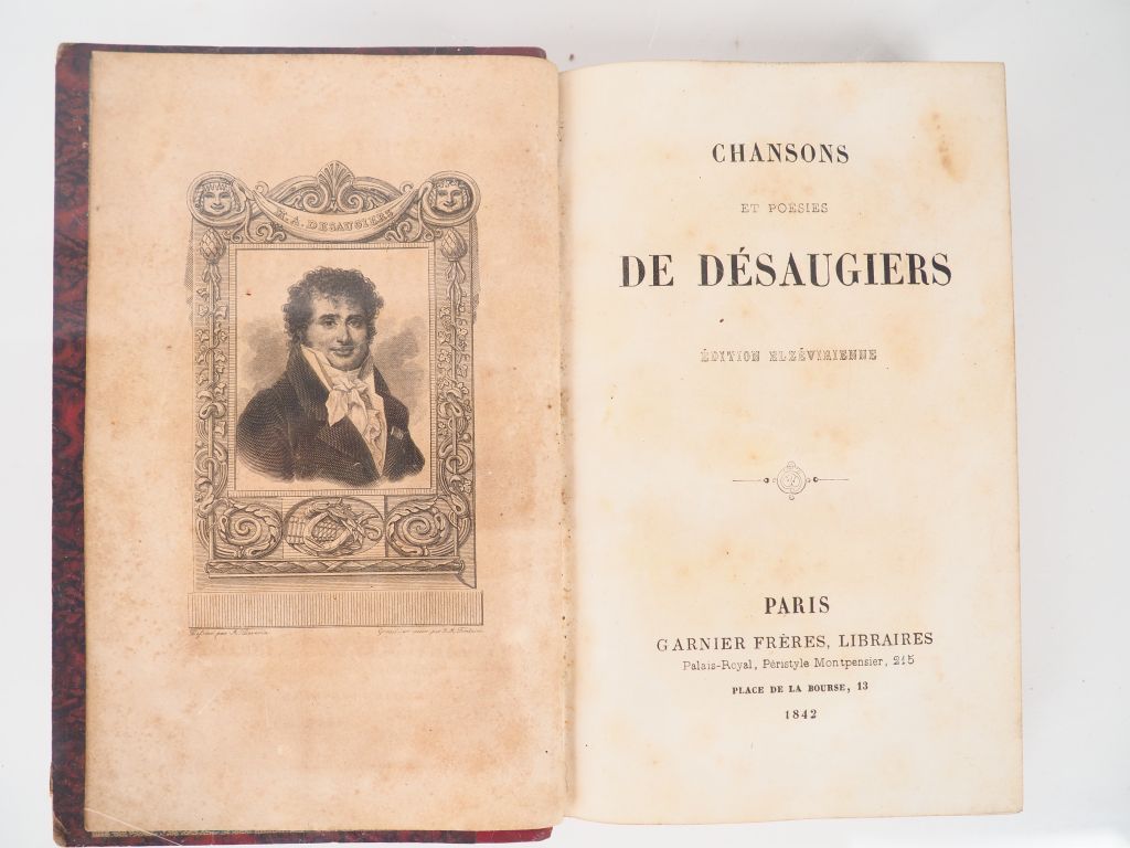 DESAUGIERS. Chansons et poésies. Edition elzévirienne. Paris, Garnier 1842. in-12. Rel. d'époque demi-veau cerise, décor rocaille doré. Portrait de 7 vignettes h.-t. (papier bruni aux planches hors-texte).