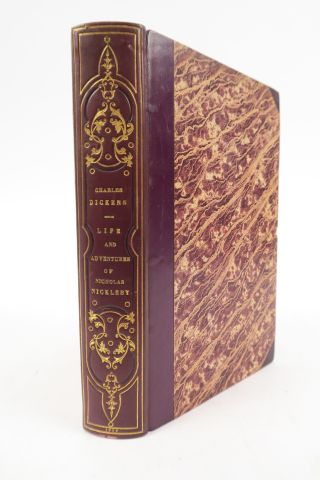 DICKENS (Charles). The fife and Adventures of Nicholas Nickleby, with illustrations by Phiz. London, Chapman and Hall 1839. in-8. 1/2 veau aubergine à pts coins, décor romantique dor. et à froid (Rel. postérieure). Illustrations gravées sur bois h.-t. Première édition.