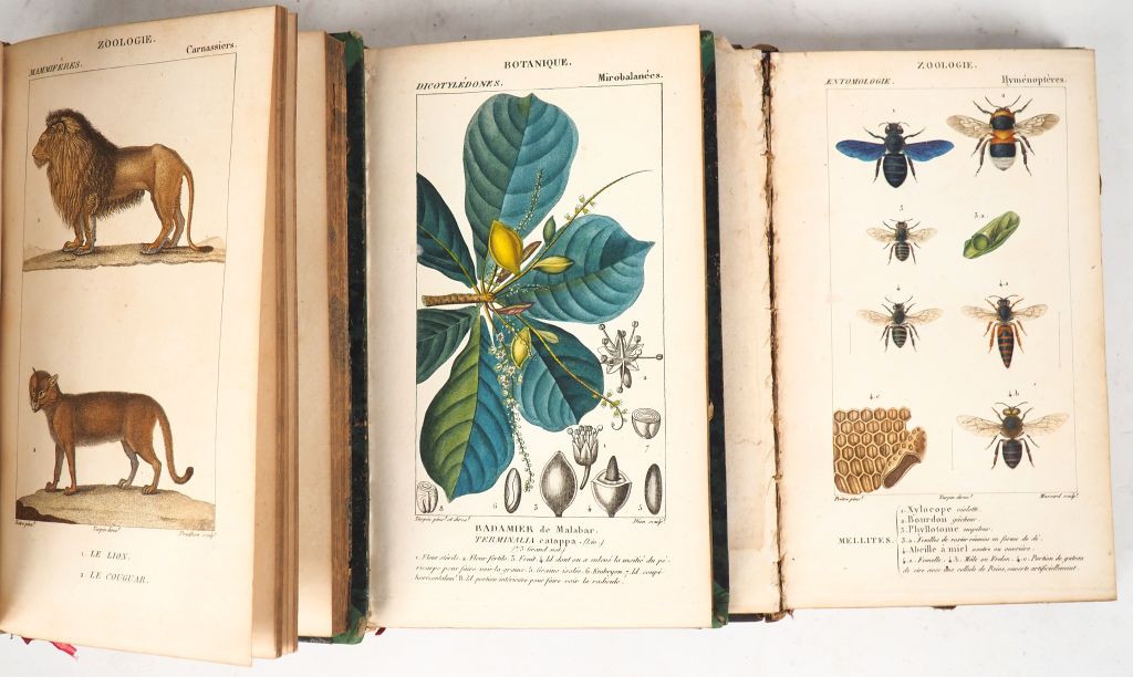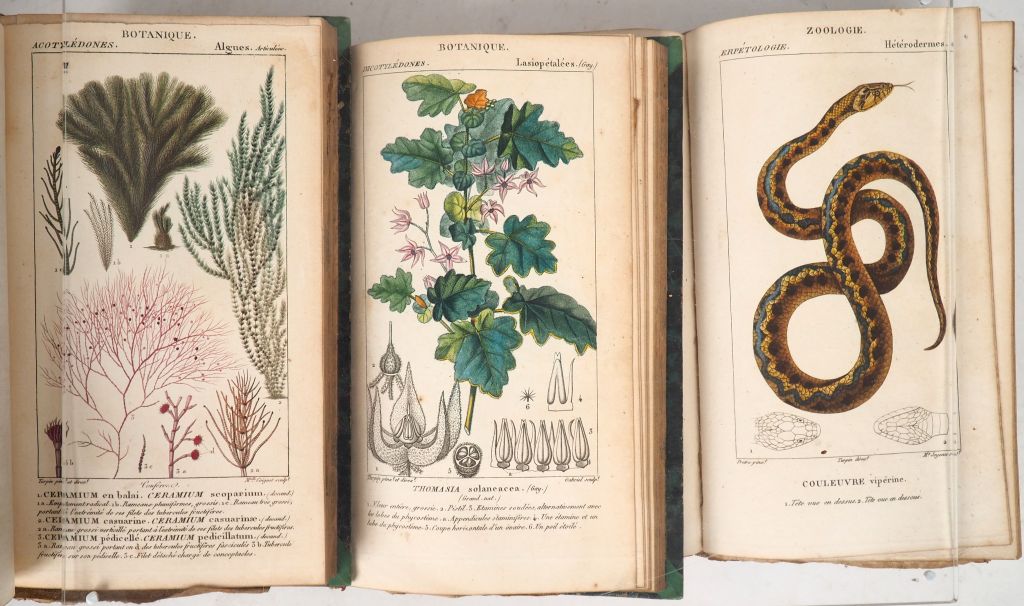 DICTIONNAIRE DES SCIENCES NATURELLES. 2ème partie : règne organisé. PLANCHES. Paris, Levrault, 1816-30. Six volumes in-8 ½ veau olive, dos lisse cloisonné et orné, titre doré, tranches marbrées (Reliure de l’époque). Reliure très défraîchie : dos passés, ors ternis, importants manques à trois dos. - ZOOLOGIE : CUVIER. Mammifères. 100 pl. (1 vol.) – DUMÉRIL. Insectes. 60 pl. – DESMAREST : Crustacés 58 pl. (1 vol.) – CLOQUET : Poissons. 85 pl. - Reptiles. 40 pl. (1 vol.). - BOTANIQUE : JUSSIEU - TURPIN. Végétaux dicotylédons. Pl. 1 à 94. (1 vol.) – JUSSIEU - TURPIN. Végétaux dicotylédons. Pl. 95 à 191. (1 vol.) – JUSSIEU - TURPIN. Végétaux acotylédons. 103 pl. (1 vol.). BEL ENSEMBLE DE 6 VOLUMES constitués de 637 PLANCHES gravées et soigneusement aquarellées (ensemble non collationné : le nombre de planches annoncé est celui qui correspond aux tables des volumes).