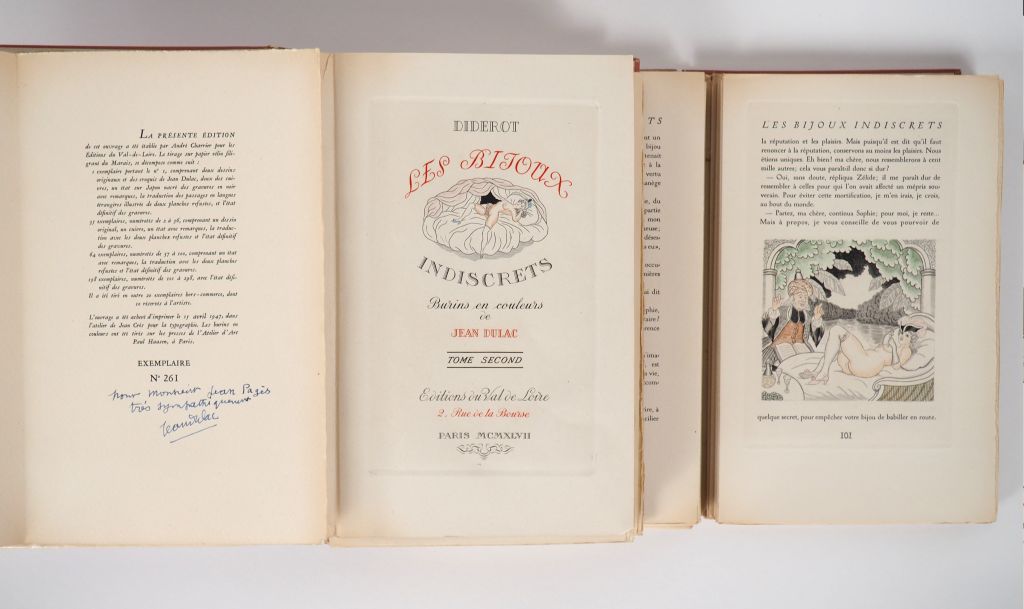 DIDEROT (D.). LES BIJOUX INDISCRETS. P., Éditions du Val de Loire, 1947. Deux volumes in-8 en ff., couverture rempliée, chemises et étui cartonné décoré. Dos des chemises passées, un côté de l’étui fendu. ÉDITION ILLUSTRÉE de 36 GRAVURES au burin en couleurs par Jean DULAC. Tirage limité à 318 exemplaires sur vélin du Marais. UN des 198 numérotés avec l’état définitif des gravures. ENVOI AUTOGRAPHE signé de l’illustrateur à la justification : « pour Monsieur Jean Pagès / très sympathiquement / Jean Dulac ».