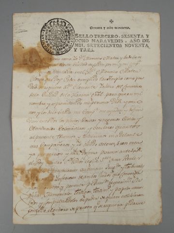 DOCUMENT MANUSCRIT. Laissez-passer portuaire pour le port de La Havane, à l'ordre d'un commerçant de Cadiz. 1793. 3 pp. in-folio. Cachet du Royaume d'Espagne, date et prix (sesenta y ocho maravedis). Taches de rousseurs et trous, avec perte de quelques mots.