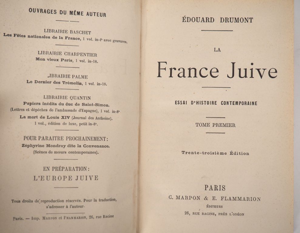 DRUMONT (É.). LA FRANCE JUIVE. P., Marpon Flammarion, sans date [fin XIXe]. 2 vol. in-12 ½ chagrin marron, dos à nerfs, titre doré (Reliure de l’époque). MENTION FICTIVE de « trente-troisième Édition ».