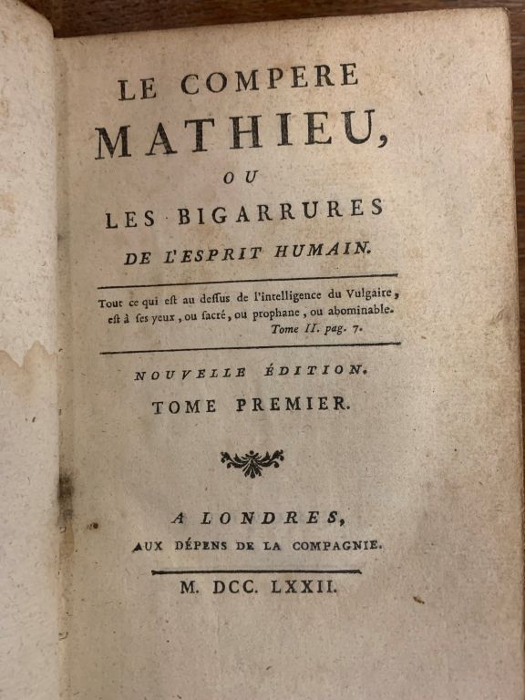 DU LAURENS. LE COMPÈRE MATHIEU, ou LES BIGARRURES DE L’ESPRIT HUMAIN. Londres, Aux Dépens de la Compagnie, 1772. Trois parties reliées en un fort volume in-12 veau porphyre, dos lisse cloisonné et orné, pièces de titre et de tomaison maroquin rouge et vert lierre, tranches dorées (Reliure de l'époque). Dos frotté, coiffe supérieure arasée. NOUVELLE ÉDITION de ce roman philosophique licencieux. ¶ Jammes, Bucher bibliographique, 425 pour l’édition de 1776 – Gay, I-637.