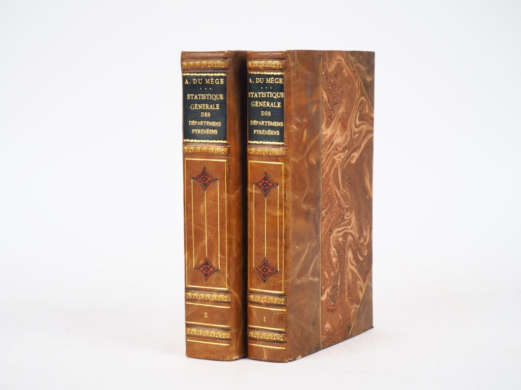 DU MÈGE (Alexandre). STATISTIQUE DES DÉPARTEMENS PYRÉNÉENS, des provinces de Guienne et de Languedoc. Paris, Treuttel et Wurtz, 1828-29. Deux volumes in-8 ½ basane fauve marbrée, dos à nerfs orné, pièce de titre chagrin noir, tête dorée (Reliure postérieure). ÉDITION ORIGINALE. CARTE dépliante des Départements pyrénéens. ¶ Labarère, 511 - « Rare », Dendaletche, 651.