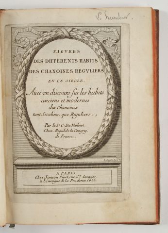 DU MOLINET (Claude). Figures des différents habits des chanoines réguliers en ce siècle, avec un discours sur les habits anciens et modernes des chanoines tant séculiers que réguliers. Paris, Simeon Piget 1666. in-4, 3 ff.-144 pp.-2 ff. Veau glacé, 4 fil. dor. d'encadr. sur les plats, dos lisse, titre dor. en long dans un cadre de fil. dor. (Rel. de l'époque). Unique édition de ce livre rare. Il comprend un titre gravé et 31 belles planches de costumes religieux gravés par Le Doyen, avec paysages et abbayes figurés en arrière-plan. Bel exemplaire. 2 petits trous sans gravité à un mors.