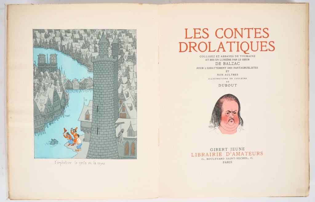 [DUBOUT]. BALZAC (Honoré de). LES CONTES DRÔLATIQUES. P., Gibert Jeune, 1940. Grand in-4 broché. Scotch transparent en tête et queue du dos. ÉDITION ILLUSTRÉE (2nd tirage) de 124 DESSINS couleurs de DUBOUT. Tirage limité à 3000 EXEMPLAIRES numérotés sur vélin de Navarre.