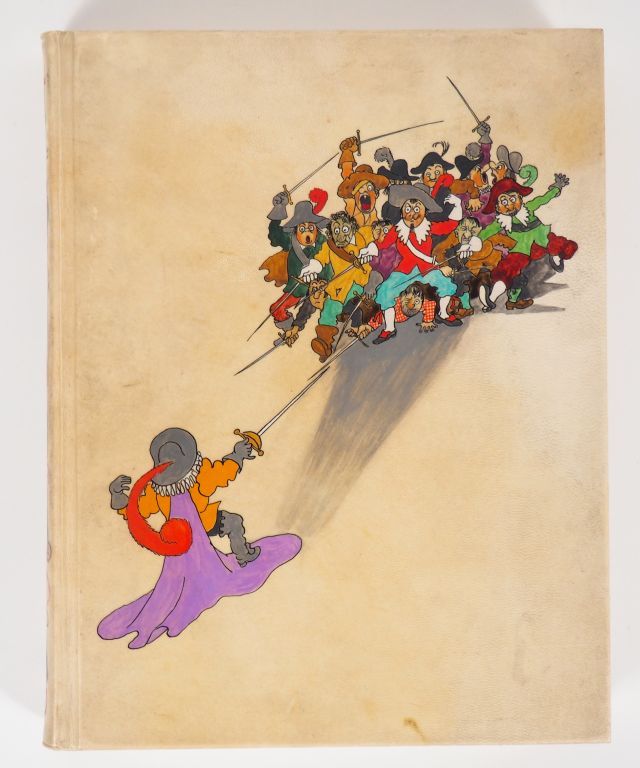 [DUBOUT]. ROSTAND (Edm.). CYRANO DE BERGERAC. Orléans, Rouam, 1947. Grand in-4 Bradel vélin ivoire rigide entièrement décoré de dessins peints en couleurs d’après Dubout, tête dorée, couverture conservée (Reliure de l’époque). ÉDITION ILLUSTRÉE de compositions en couleurs de DUBOUT. Tirage limité à 1636 exemplaires. UN des 1500 numérotés sur vélin de Rives blanc.