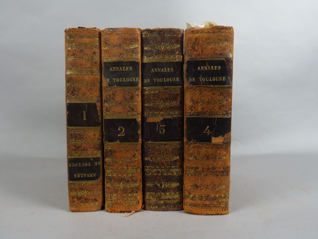 DUROSOI. Annales de la ville de Toulouse, dédiées à Monseigneur le Dauphin. Paris, Veuve Duchesne 1771-1776. 4 vol. in-4. Veau moucheté, dos lisse, roulette et fleur. dor., tr. marbr. (Rel. début XIXe s.). (Reliure frottée). On y joint un tome V qui est en fait le volume du Supplément du Tome IV, relié à part en veau d'époque, faisant double emploi.