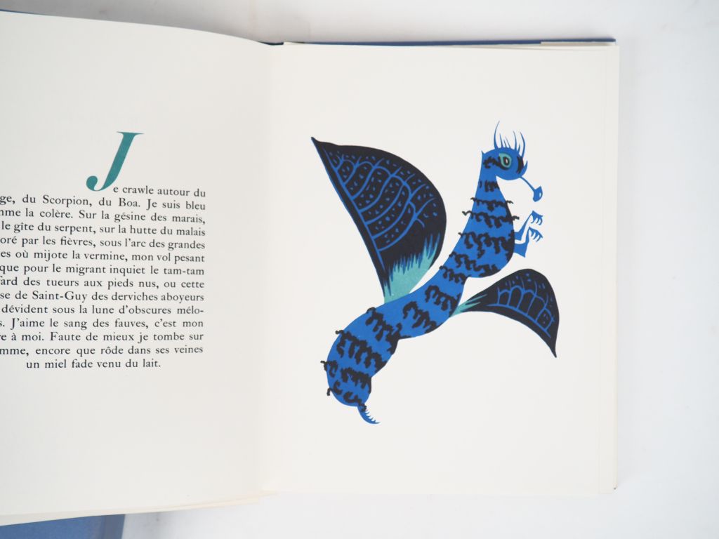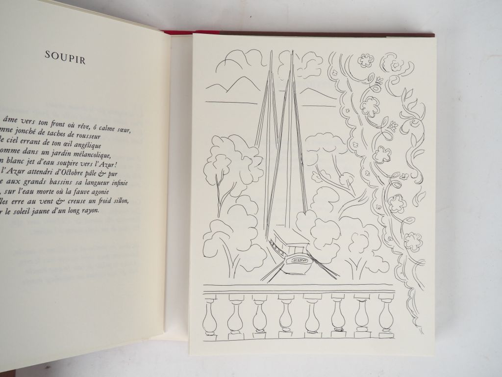 [EDITO-SERVICE]. BEL ENSEMBLE DE 8 OUVRAGES ILLUSTRÉS reproduisant en fac-similé les œuvres originales. Tirage numéroté sur papier bouffant. 8 vol. in-folio en ff. sous chemise et étui de l’éditeur. - LÉGER (F.). MES VOYAGES. Avec un poème d’Aragon et des lithographies de l’auteur. - RABELAIS (F.). PANTAGRUEL. Orné de bois en couleurs dessinés et gravés par André DERAIN. - MALLARMÉ (S.). POÉSIES. Eaux-fortes originales de Henri MATISSE. - FLORILÈGE DES AMOURS DE RONSARD. Ill. par H. MATISSE. - VERLAINE (P.). PARALLÈLEMENT. Lithographies originales de Pierre BONNARD. - DORGELÈS (R.). VACANCES FORCÉES. 472 bois en couleurs de Raoul DUFY. - OVIDE. LES MÉTAMORPHOSES. Eaux-fortes de PICASSO. - LURÇAT (J.). GÉOGRAPHIE ANIMALE. 18 lithographies de JEAN LURÇAT.